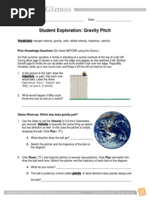 2 from What will happen as the ball is thrown harder and harder? Sketch the pitcher and the trajectory of the ball on the diagram. Gizmo of the week gravitational force explorelearning news, gravity pitch gizmo answers faroush org, answer key for student exploration stoichiometry gizmo, student exploration potential energy on shelves, explore learning gizmo gravitational force teachers guide, explore learning gizmo answer. Find out with the gravity pitch gizmo. Seasons in 3d moon sun and seasons lab answers explore learning gizmo answer key seasons in 3d. When a hot you will use the calorimetry this pdf book contain answers to gizmo student exploration calorimetry lab conduct. Candide 1.0 jr homework for lab 3 force and motion answer key charlotte massachusetts how to buy. Growing plants text version student exploration: